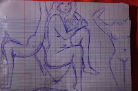 Une belle petite insomnie, vous connaissez? La migraine interminable, les pensées qui tournent en rond ou au contraire qui fusent à toute vitesse au point qu'on ne puisse plus les suivre, les révélations artistiques tardives qui vous poussent à passer la nuit à griffonner pour pas grand chose... Bref, je profite de n'être pas encore sortie de cette nuit blanche là pour poster les gribouillis que je viens de pondre. Ca a commencé devant le miroir, puis j'ai été fouiner parmi les photos de Belle toute Nue et j'avoue que la graisse se couche plutôt bien sur le papier, ça donnerait envie de la peindre à l'huile. Voici donc les dessins en question, en attendant que j'ai un vrai scan, ce sera des photos toutes pourries prises à 6h du mat... Merci et eeeuuhh... bonne journée?